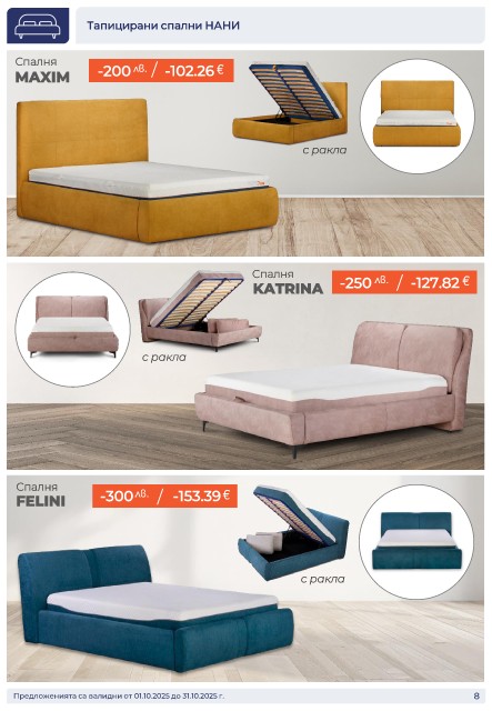 Тапицирани спални НАНИ Спалня / MAXIM -200 -102.26 с ракла Спалня KATRINA -250 / -127.82 с ракла Спалня FELINI -300 / -153.39 с ракла Предложенията са валидни от 01.10.2025 до 31.10.2025 г. 8