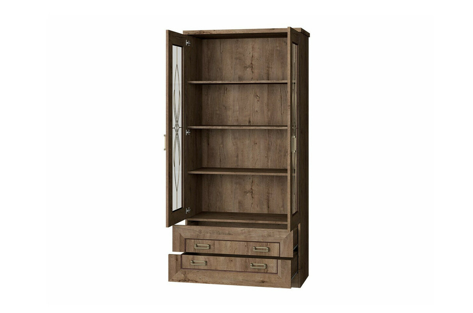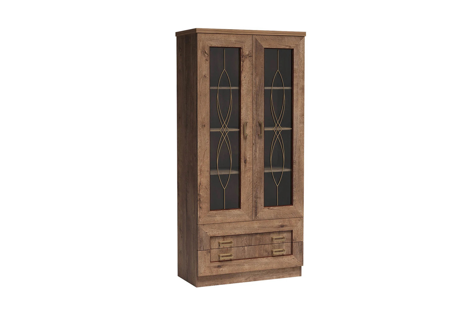 Витрина T-8 впечатлява със своя класически дизайн, съчетаващ масивна конструкция с елегантно рамкирани MDF профили на лицевата част и богатата, естествена текстура на топъл декор дъб лефкас.